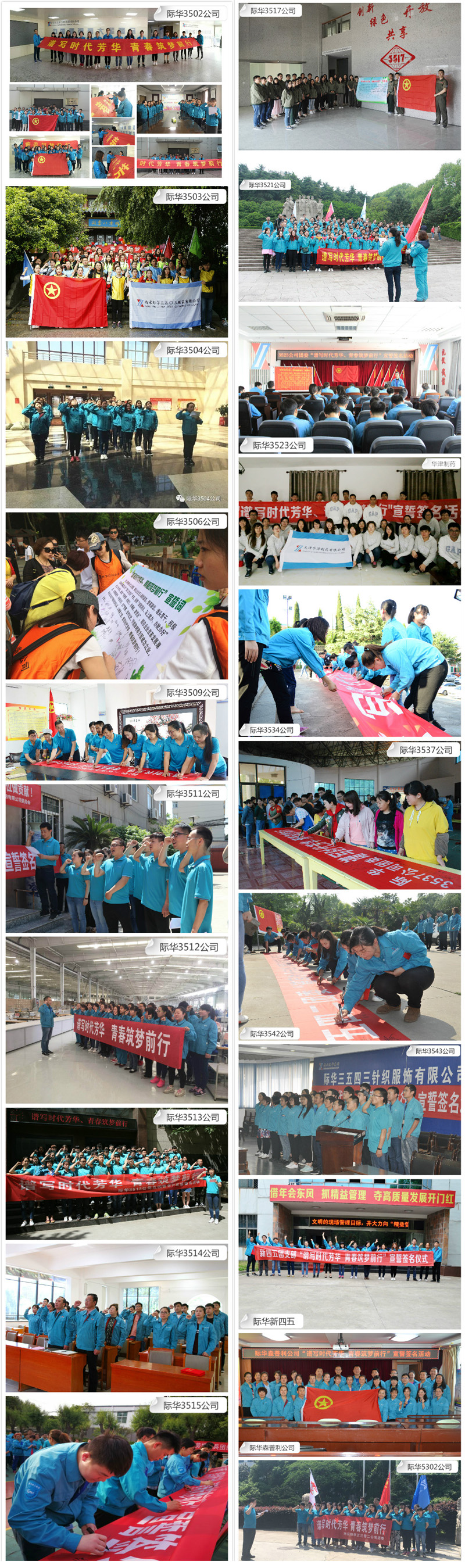 值此纪念建团96周年、“五四”运动99周年之际,际华集团团工委向全集团青年员工发出倡议书,并组织所属各企业于“五四”青年节前夕开展“谱写时代芳华、青春筑梦前行”宣誓签名活动,充分展现了际华集团青年的风采。