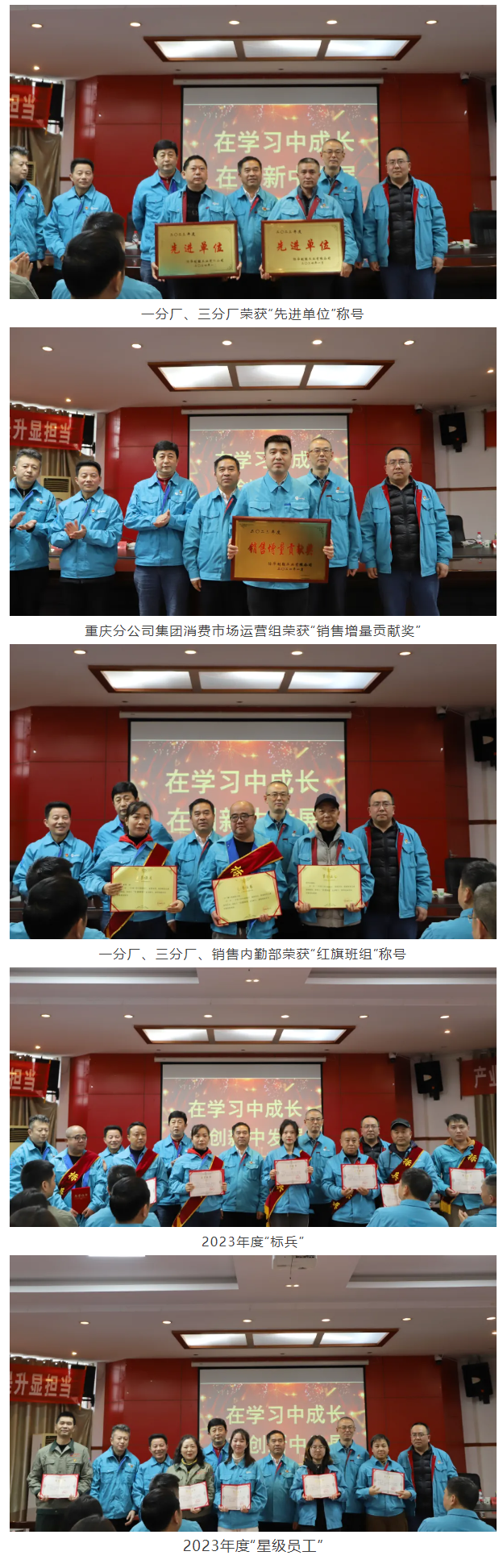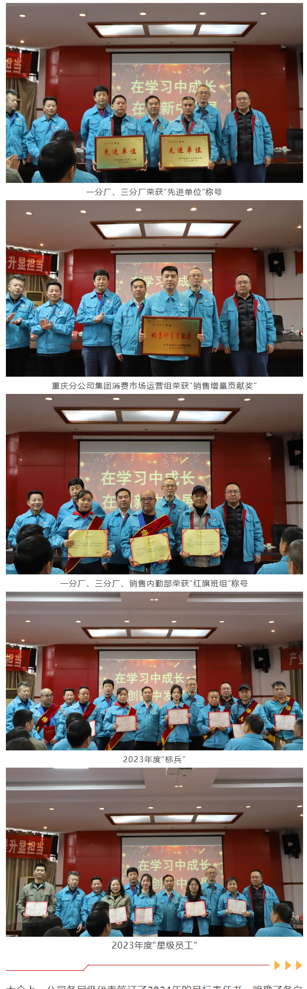 大会隆重表彰了2023年度的先进集体和个人,一分厂、三分厂荣获“先进单位”称号,重庆分公司集团消费市场运营组荣获“销售增量贡献奖”,一分厂、三分厂荣获“工会先进分会”称号,一分厂、三分厂、销售内勤部荣获“红旗班组”称号,刘炬炬、岑英等8人荣获“2023年度标兵”称号,詹燕娥、尤庆萍等7人荣获“2023年度星级员工称号”,韦明建、史祖洪等44人荣获“2023年度社会活动积极分子”称号。大会上,公司各层级代表签订了2024年的目标责任书,明确了各自的任务和责任。同时,还签订了党建、党风廉政、信访维稳、意识形态等方面的目标责任书。副总经理杨俊、罗盛勇、龙斌、谢锐刚,总经理助理周宇,技术研发中心主任张世林分别进行了表态发言。